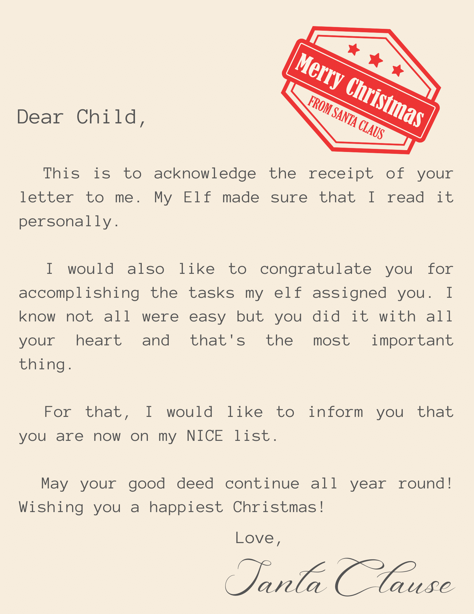 There is also a letter from Santa himself! The letter congratulates the child for doing the tasks the elf assigned and assures them that they are in fact on Santa’s nice list. There is also a printable envelope to put the letters in.