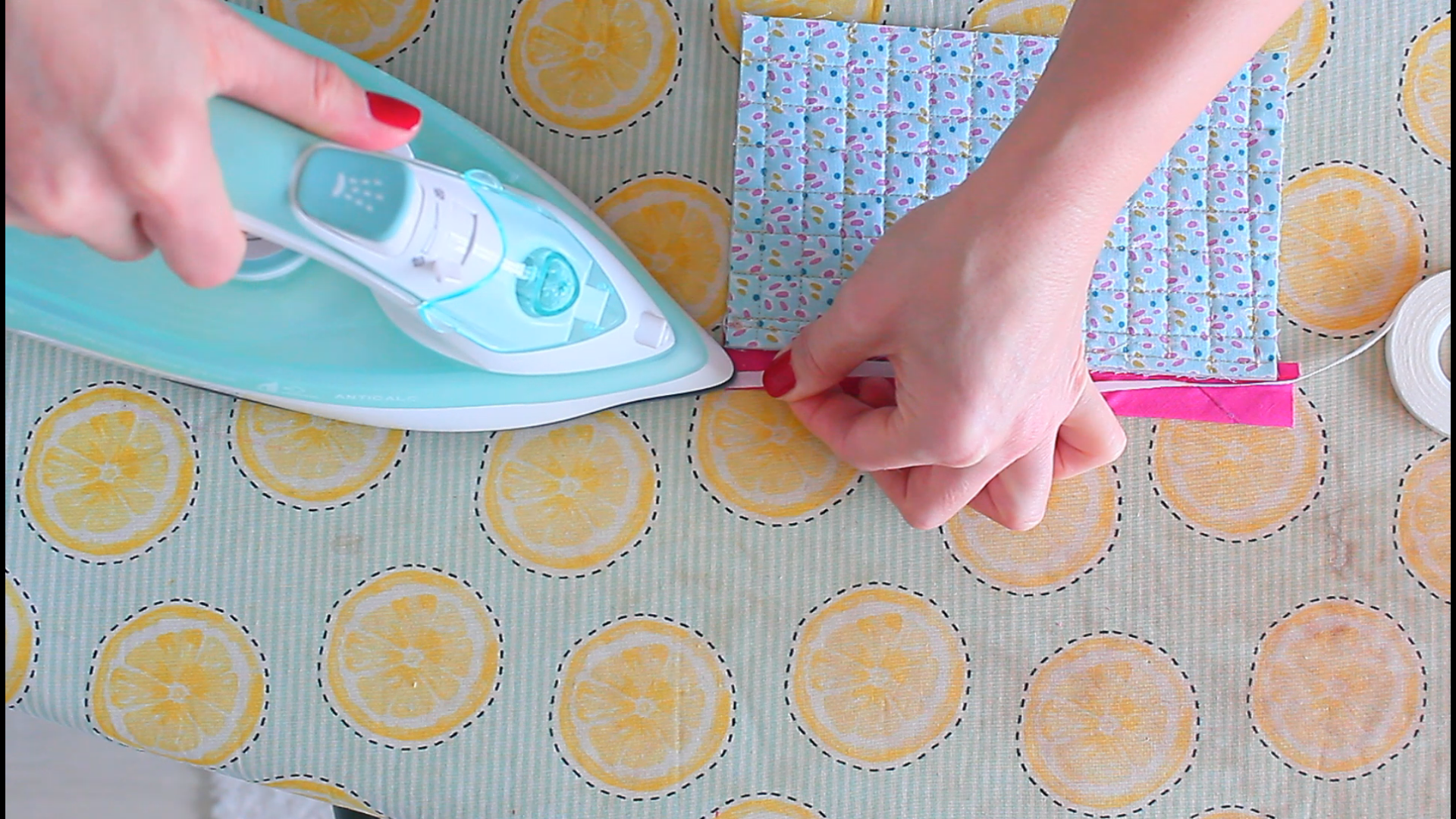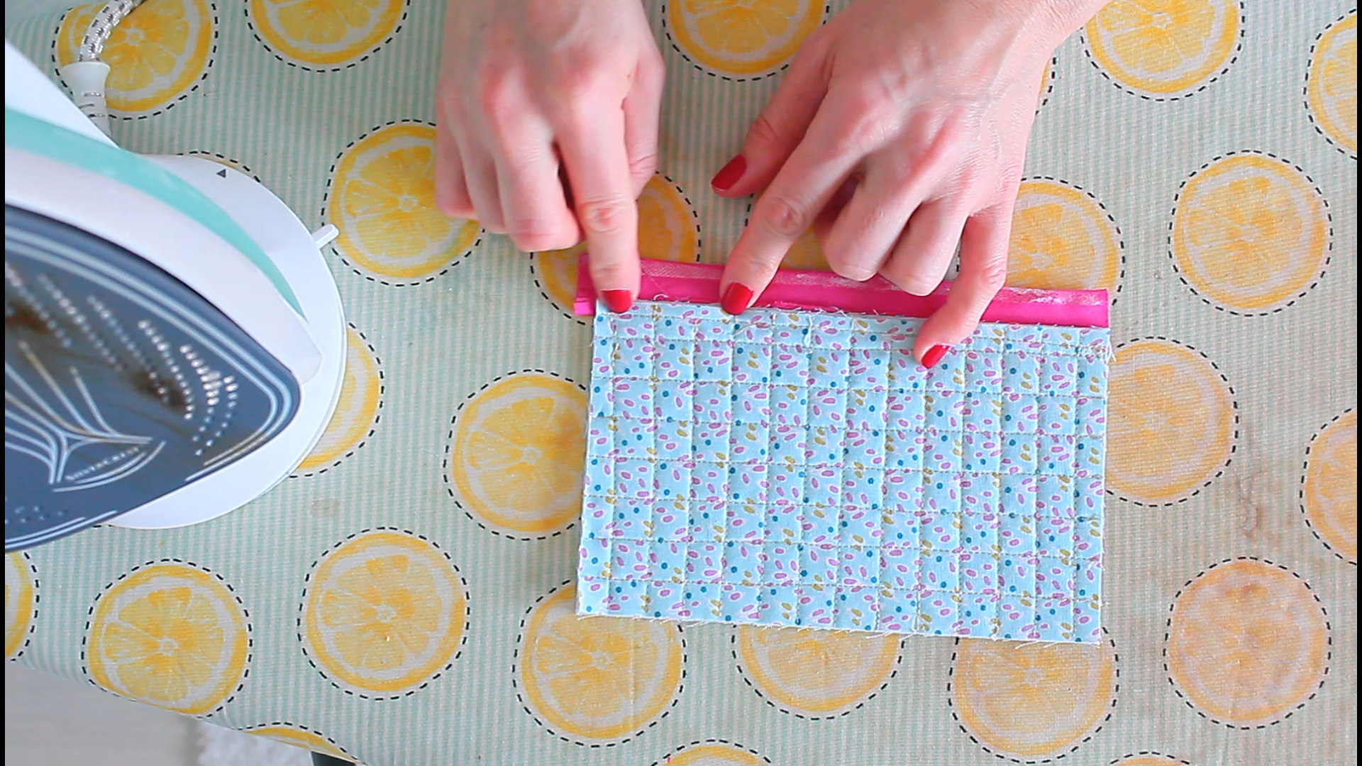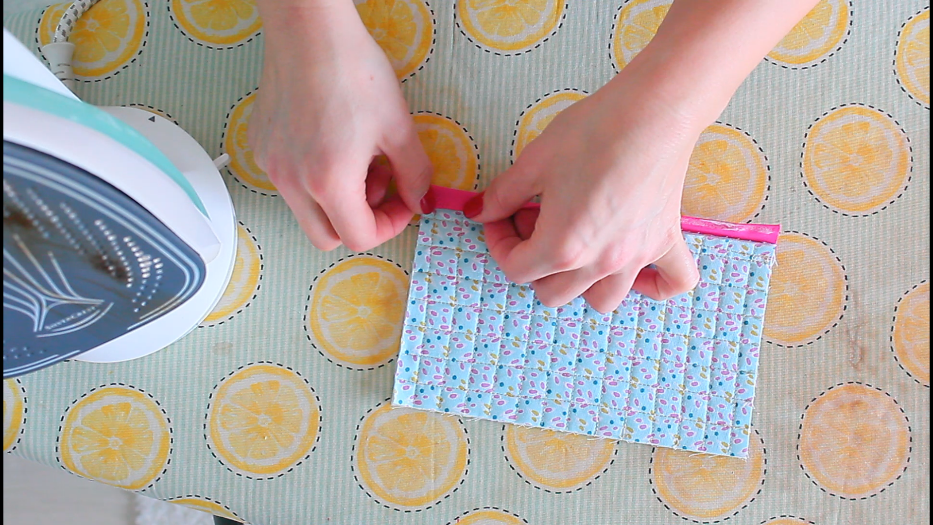 - Using your hands and the iron, press the edge of the binding down again, over the seam, so that it covers it just a tad.