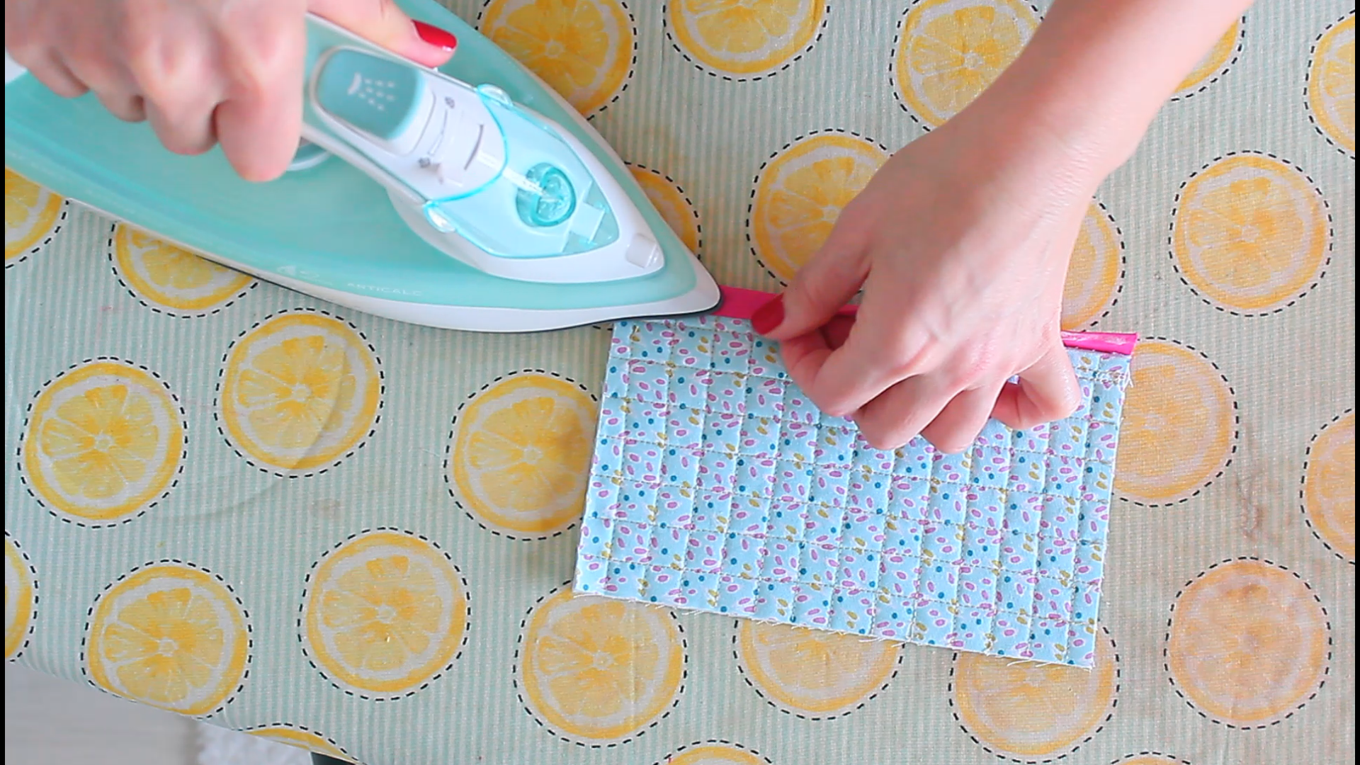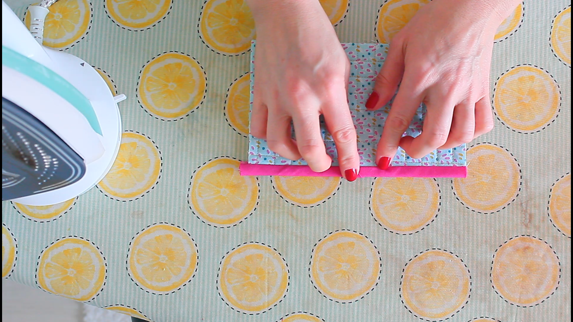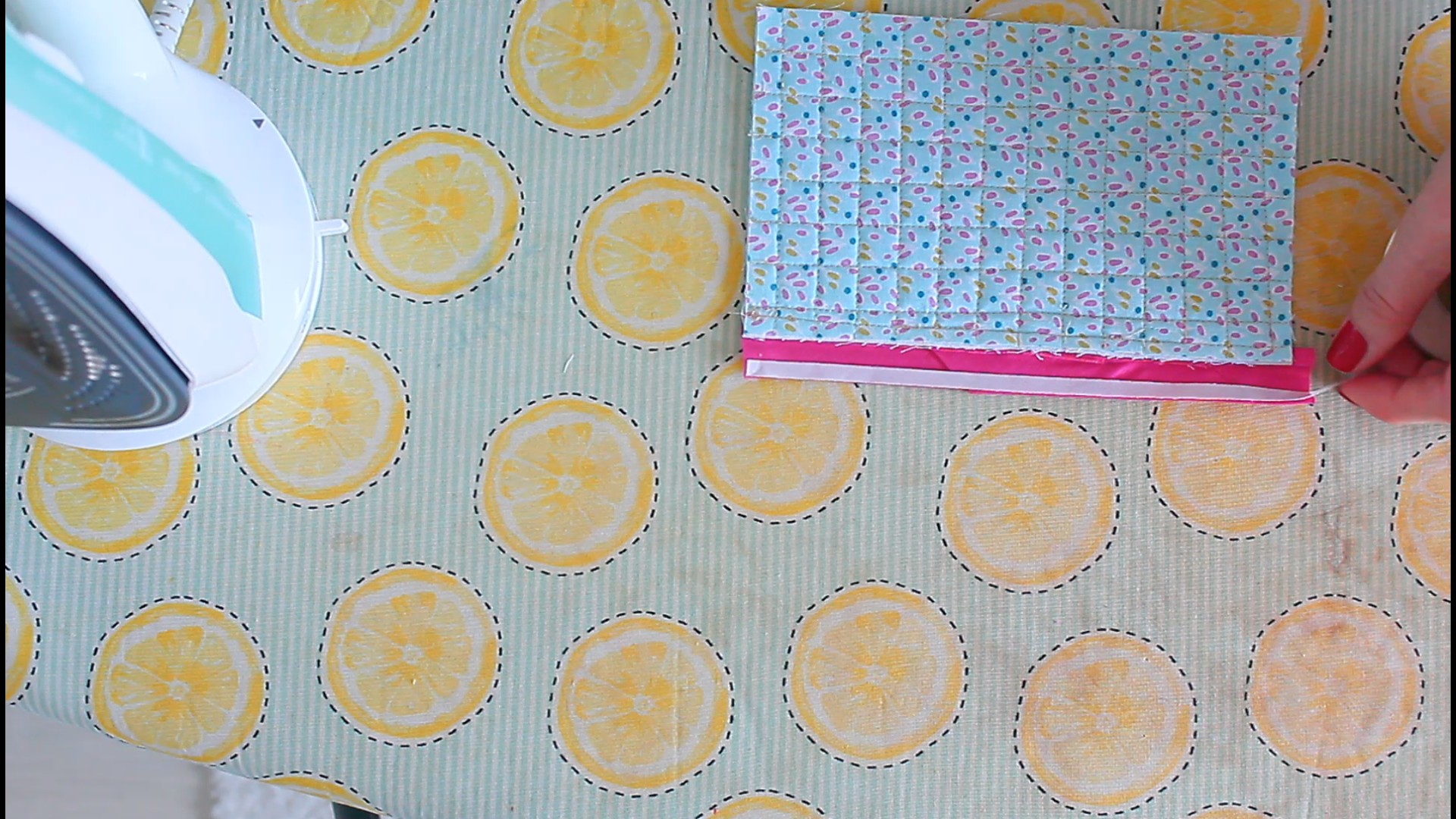 - Using your hands and the iron, press the edge of the binding down again, over the seam, so that it covers it just a tad.