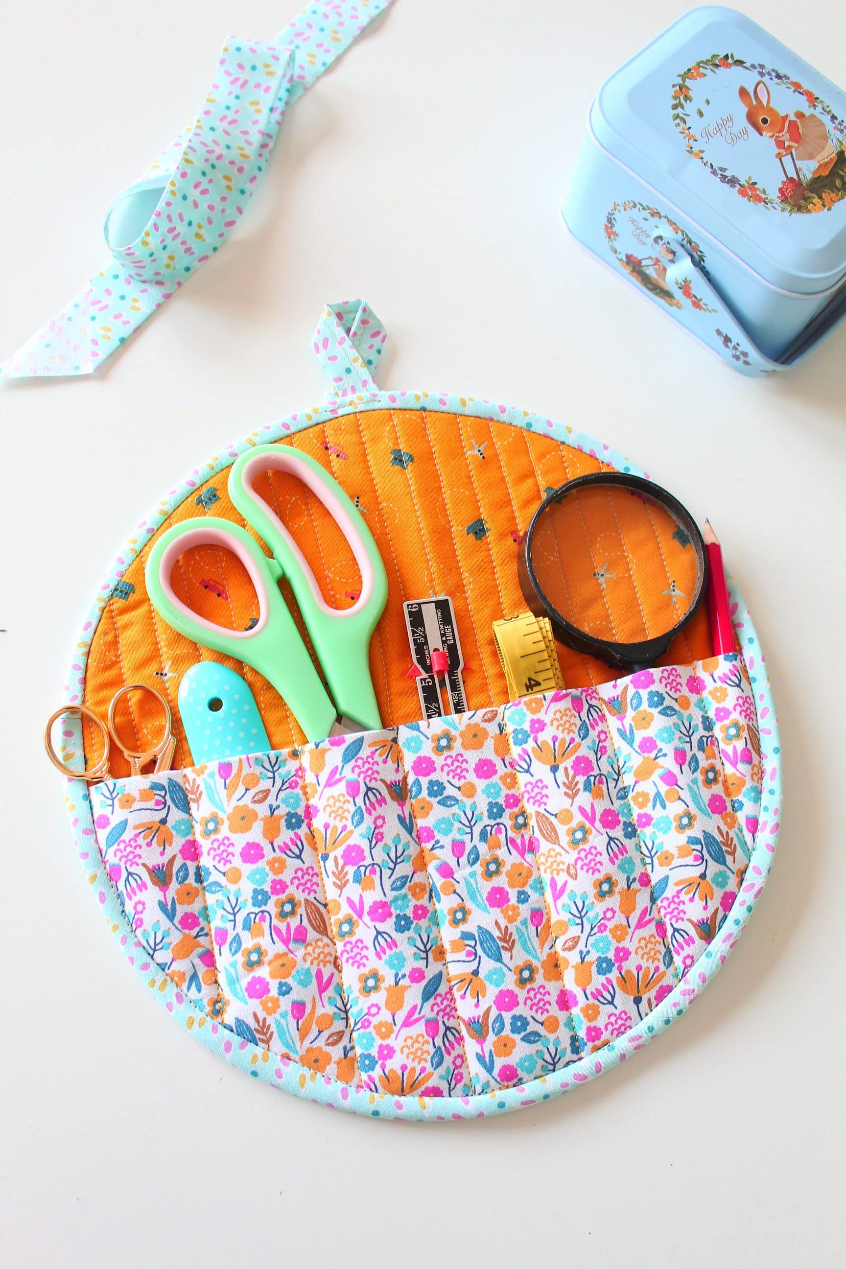 If you’re short on commercial bias binding, you can always create your own from any fabric that complements your project. I for one am a big fan of making my own bias binding and bias tape strips, I haven’t used a store-bought one in ages. Here’s the entire series related to making and using bias.