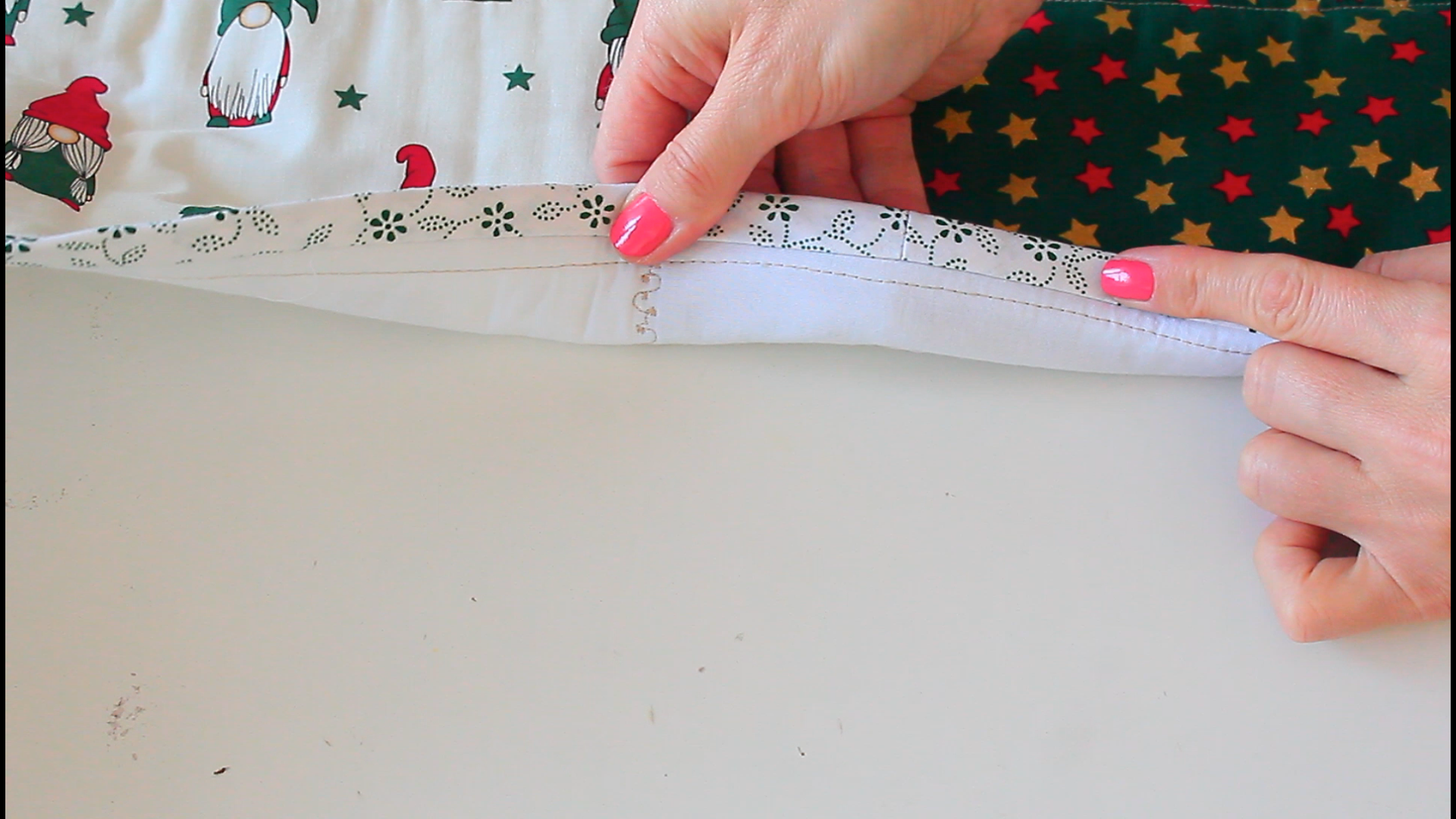 - Align the binding against the quilt edge, fold the ends again to a side and press. Continue sewing the bias to the quilt, from where you left and stopping where you first started to sew.