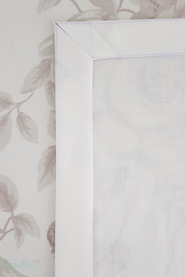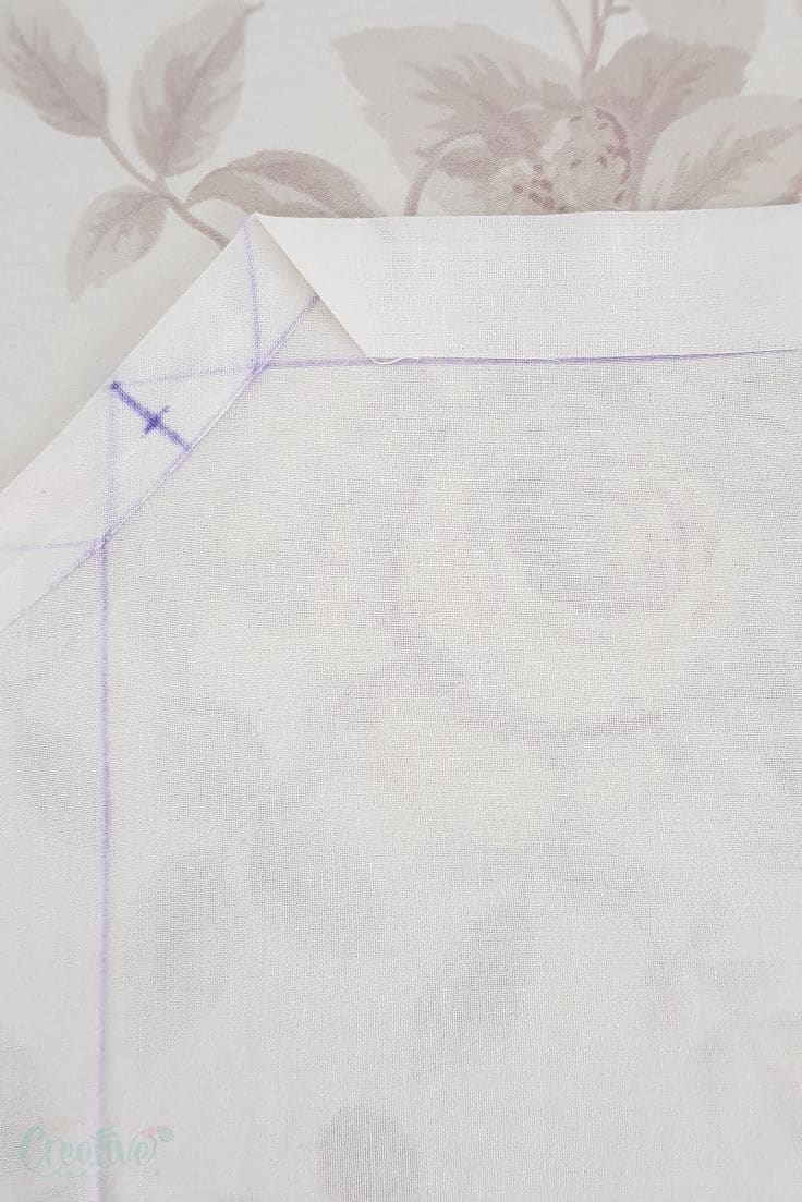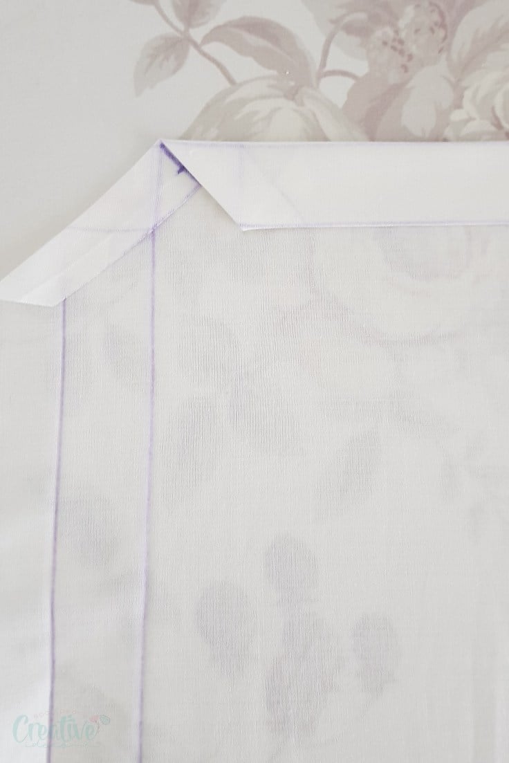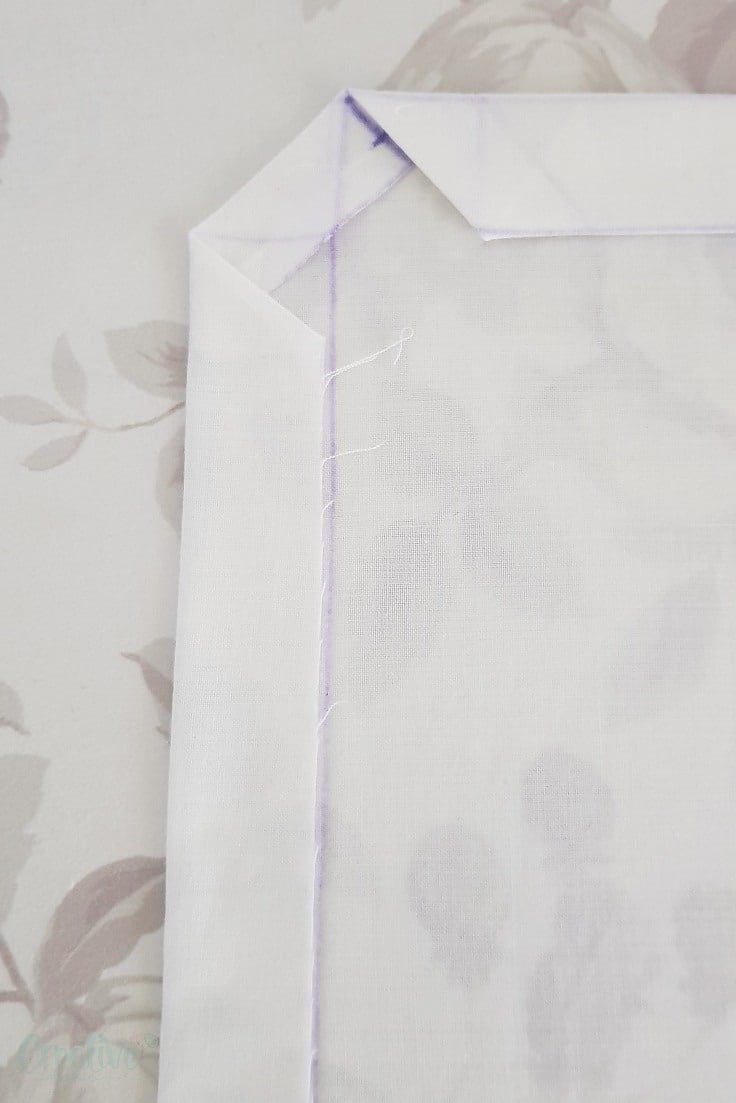 5. Bring the fabric to the ironing board and with your iron on high steam, press the edges in, following the lines traced on the fabric. Start with the first line, then the second line. Give the fabric a nice press on each line.