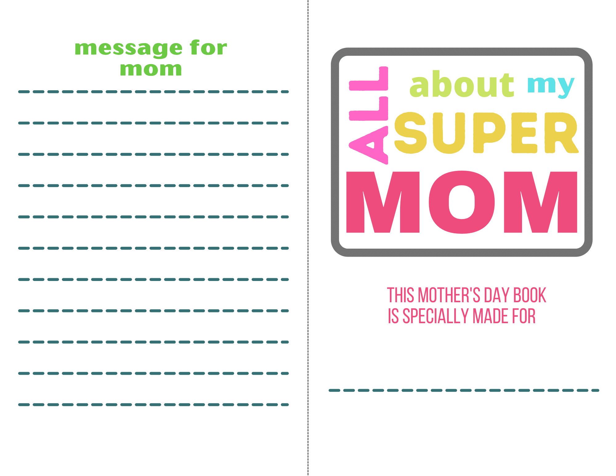 In this lovely mom book kids get to write a message to mom, a few things about mom, things they love about mom. There’s also a place for gallery where they can stick their most favorite photos with mom. On the last page, kids can draw or paint mommy art ideas.