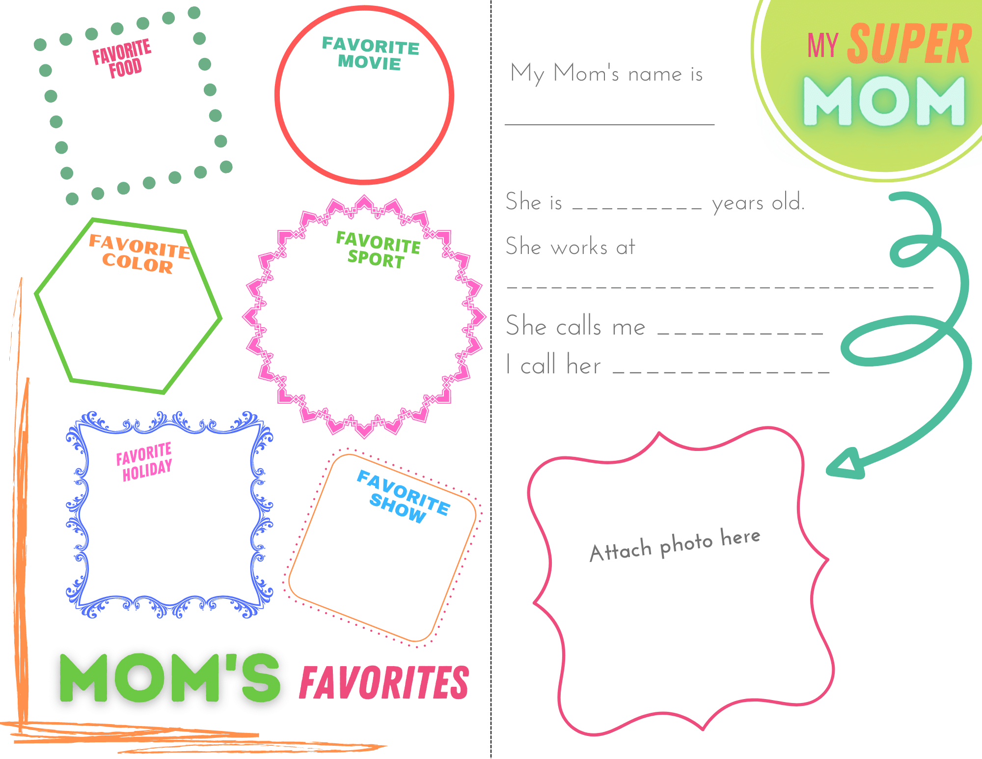 After your kids are finished answering the questions, they can attach their favorite photo of them and their mom together on the next printable from this pack. Or draw a small picture of mom to attach to the side of the mom printable.