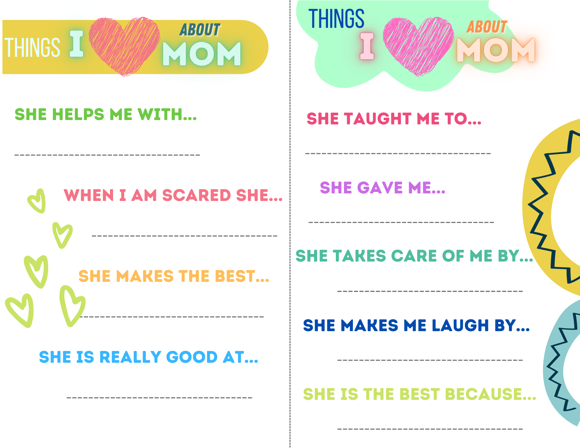 The fill-in-the-blank worksheet on this little printable gives your kids a chance to describe the different ways they love their mom, by providing them with simple writing prompts, like: