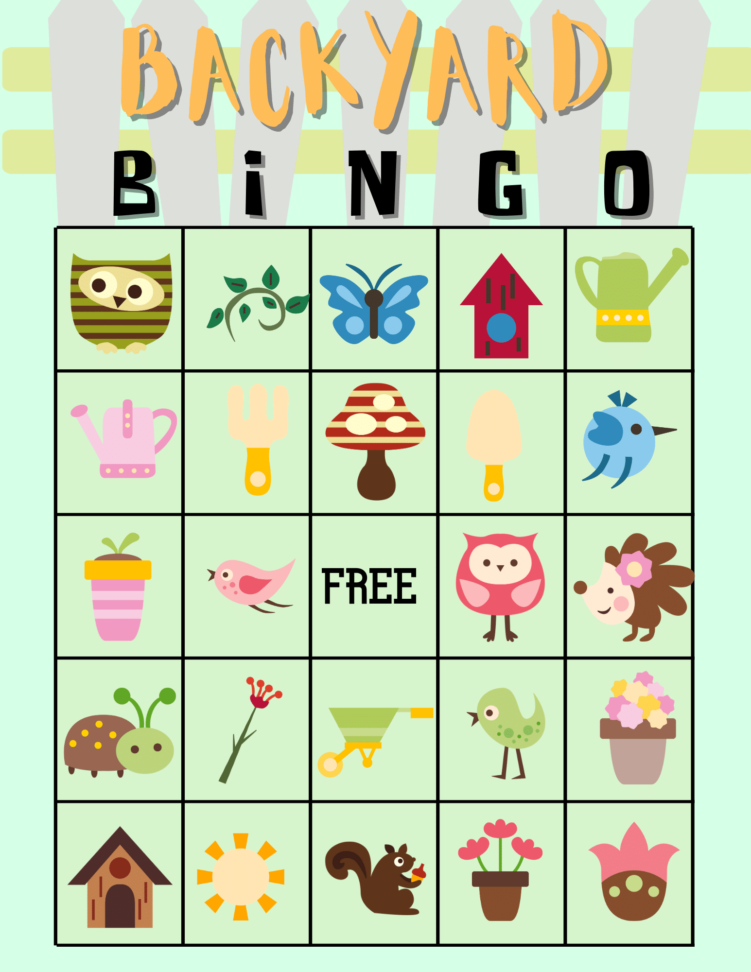 These free printable games feature 24 different images that are backyard-themed, on each bingo card, including: