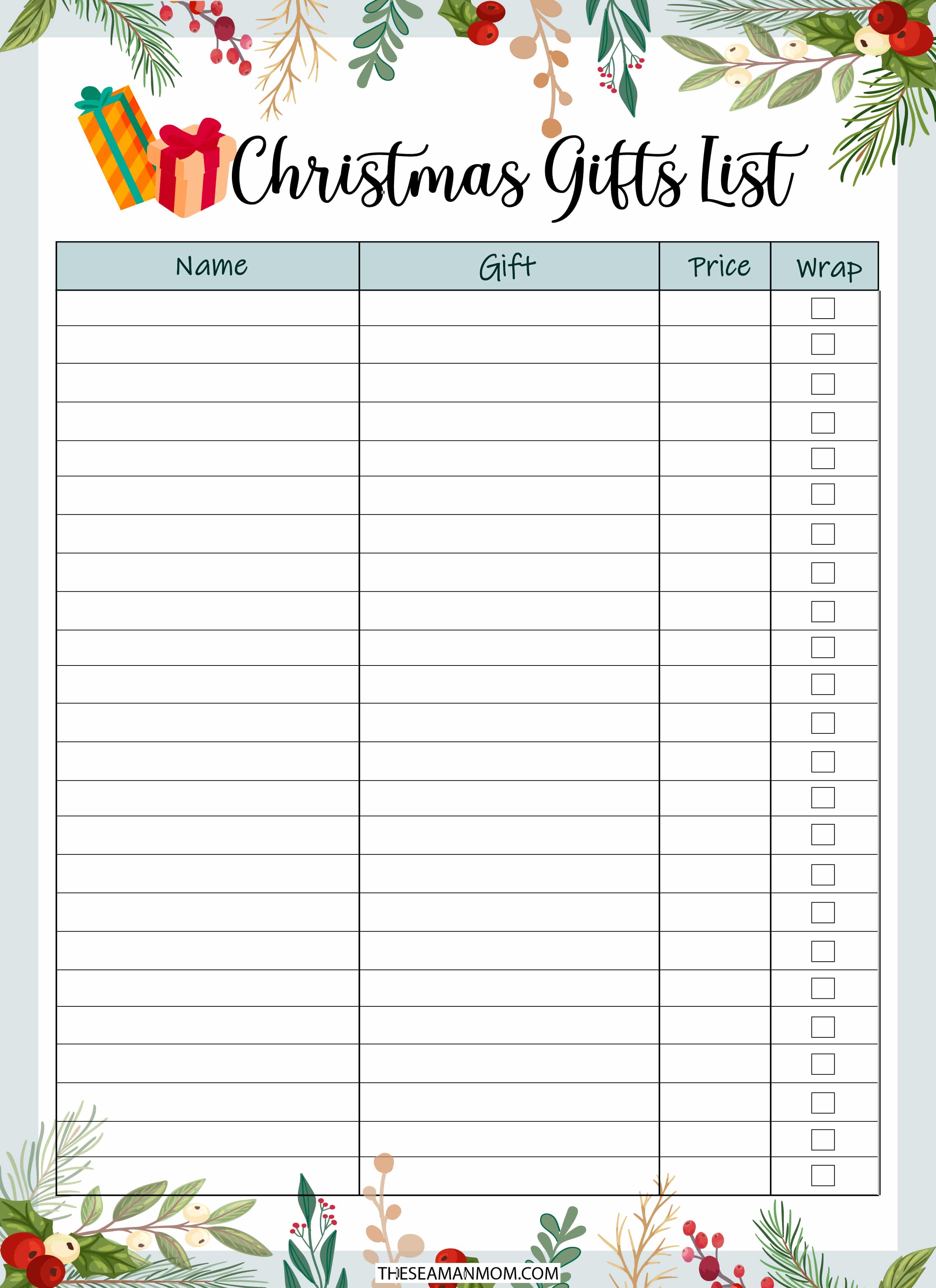 Don’t forget to buy a present for each one of your friends and family members by keeping track of your purchases on a Christmas gift planner page. Write down the name of everyone you want to purchase a gift for. Then track what you bought after you make the purchase. The planning page will also help you stay on budget by allowing you to record how much you spend on each gift.