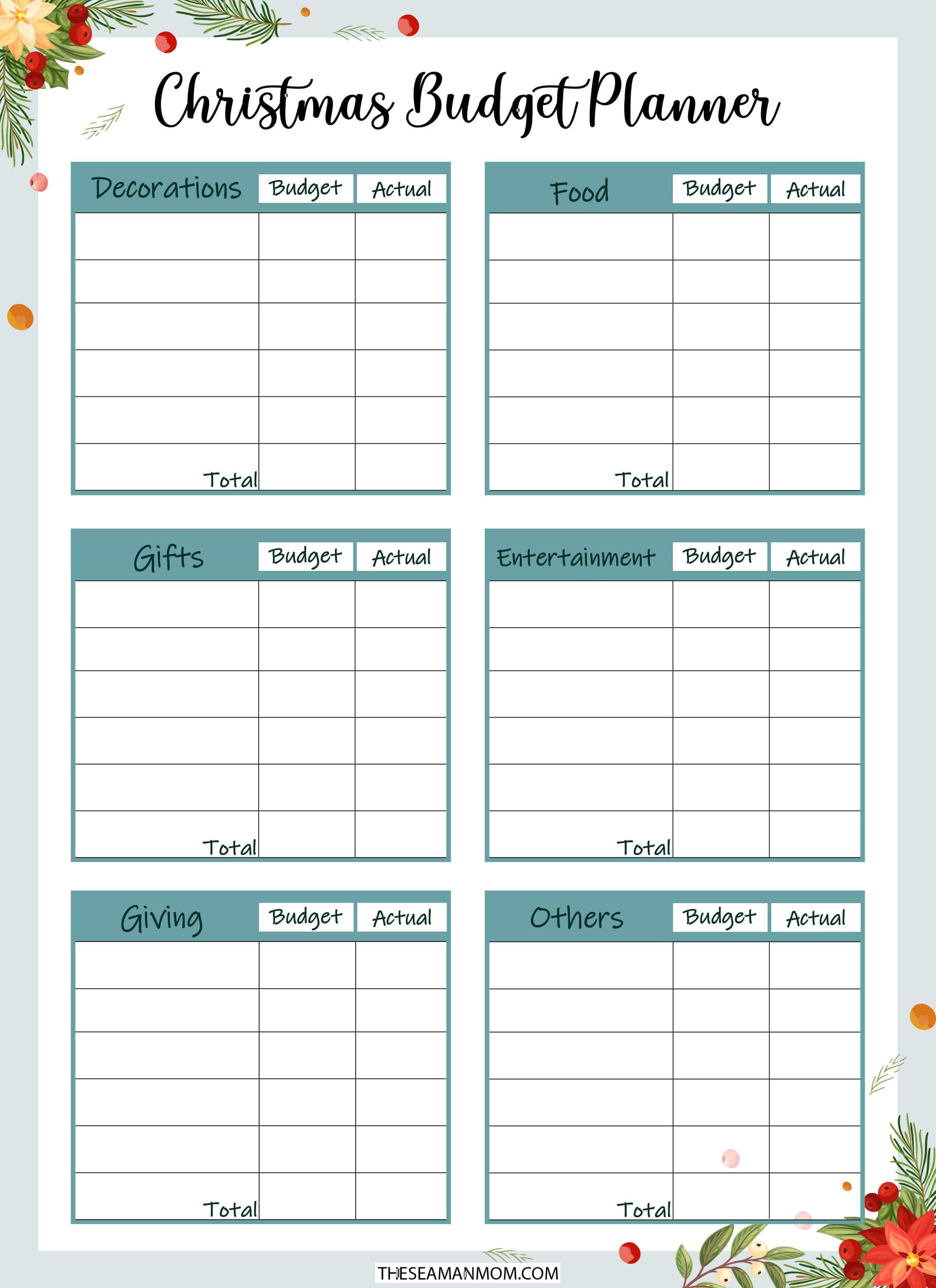 Take your holiday budgeting a step further! Track all your Christmas expenses on one budget planning sheet. With the help of this planning page, you can track your budget and spending in holiday categories, like decorations, food, gifts, entertainment, and giving.
