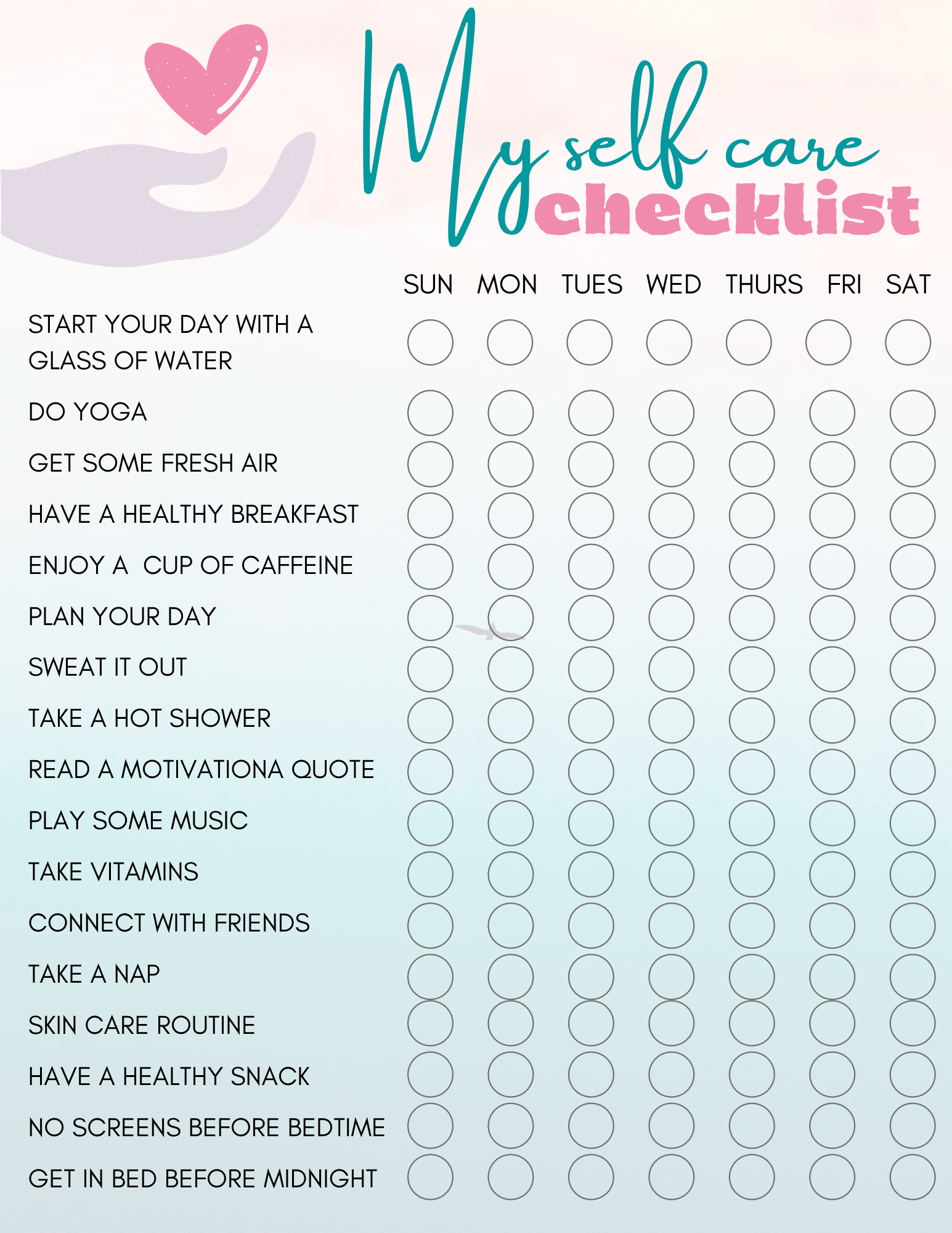 - Self care checklist. Keep track of your daily activities to ensure you’re taking time for yourself on a regular basis with the help of a checklist.