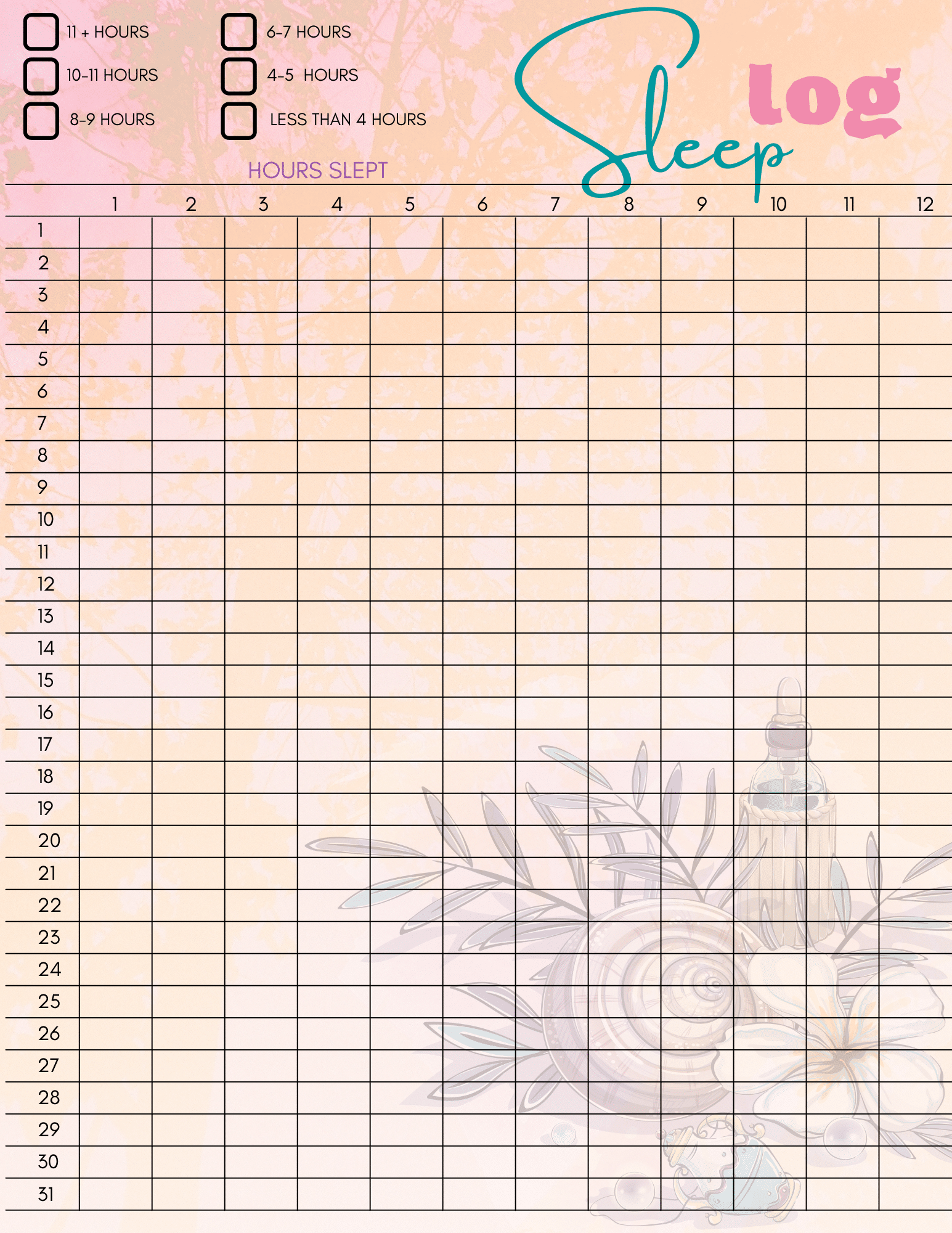- Sleep log. Tracking your sleep can help you see if you’re having issues going to sleep and if you’re getting enough shut-eye each night.