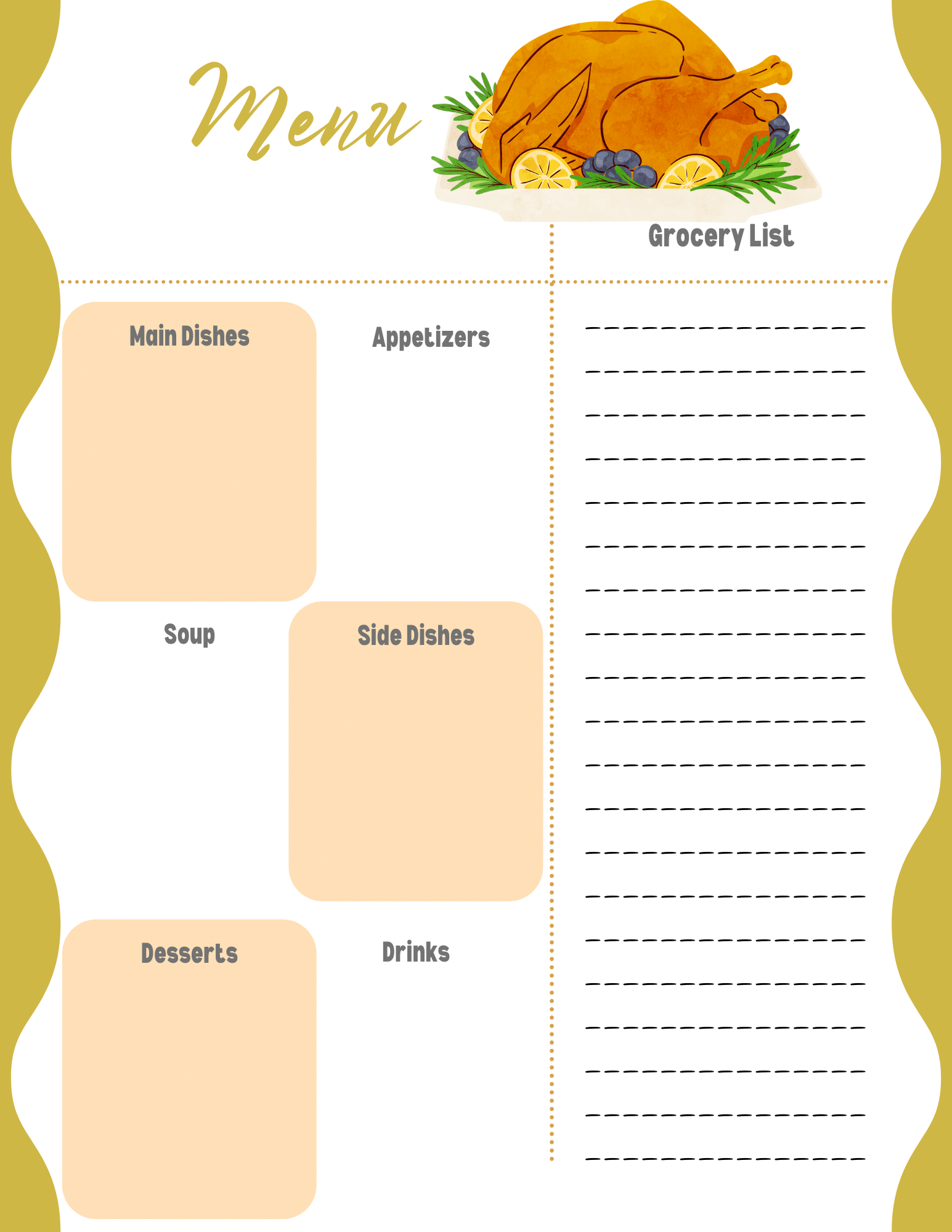 Of course, the menu is the start of the show! There is a spot to jot down your main dishes, appetizers, soup, side dishes, desserts, and drinks. You can also create your grocery list right on the same page.