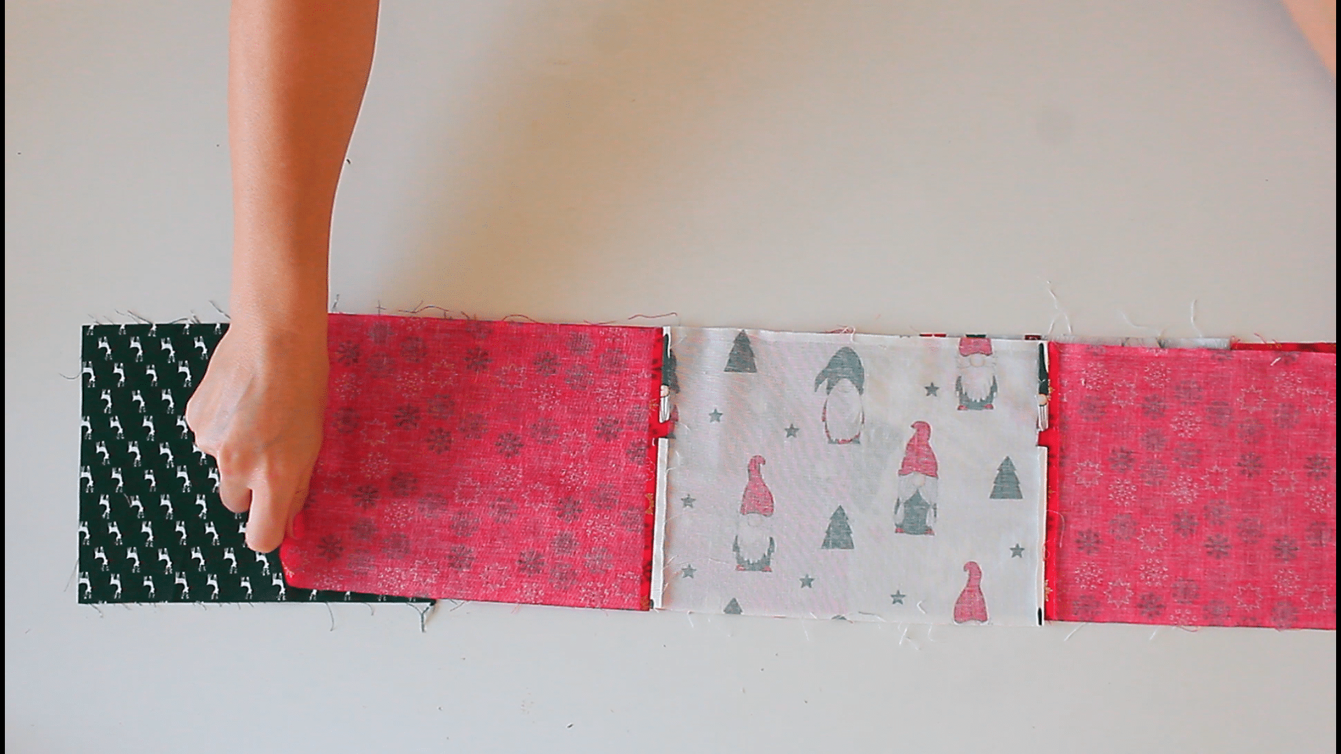- Sew on one of the long edges, using a 1/4″ seam allowance. Repeat for the third row.