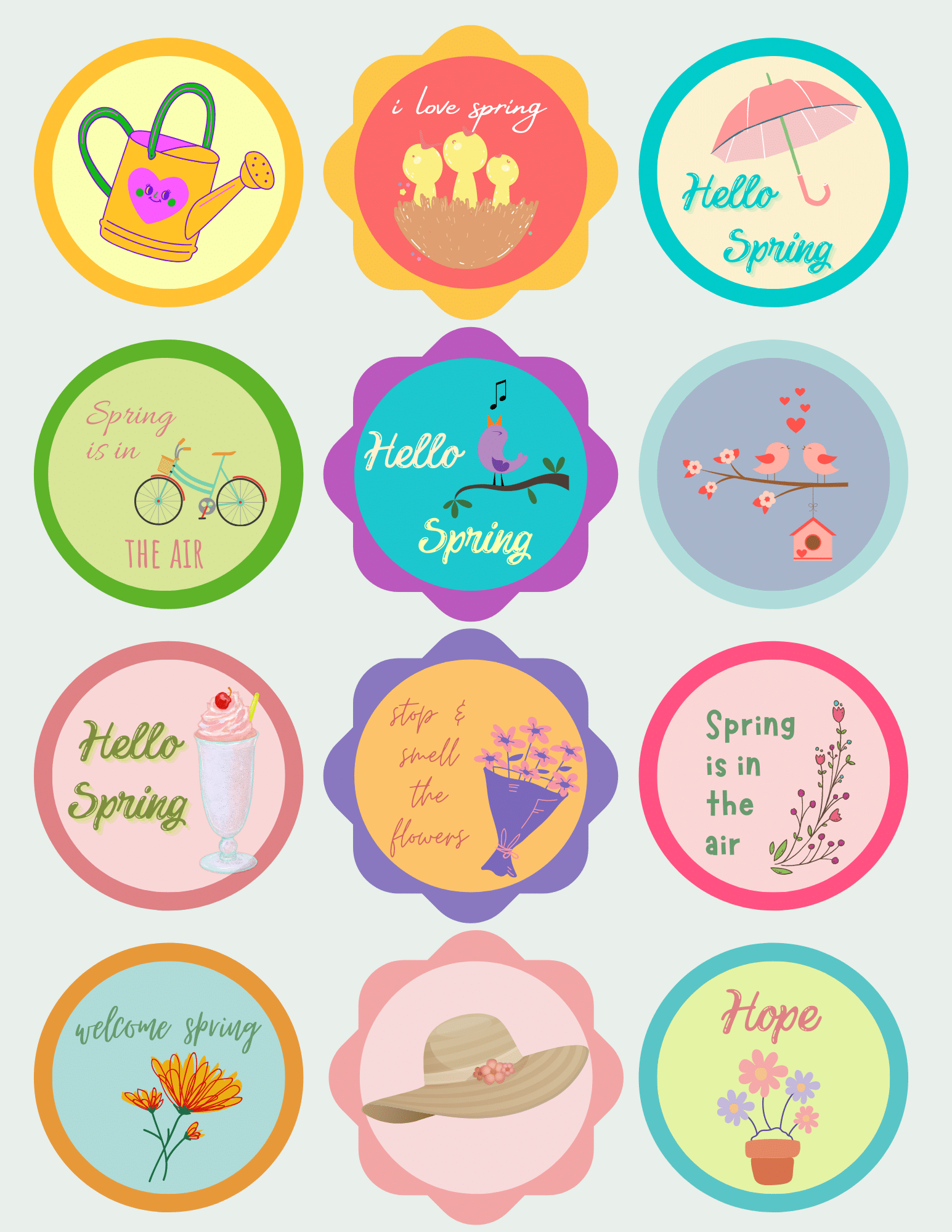 This printable set includes an introduction page and 24 spring cupcake toppers with a beautiful variety of different backgrounds and fun shapes (I absolutely love the scallops!). You’ll love the floral prints and other garden related decorations on solid background on these fun printable toppers! In addition to spring inspired designs, like watering cans, umbrellas, flowers, and birds, these fun cupcake decorations (that work just as great as cake toppers too) also come with different spring phrases such as: