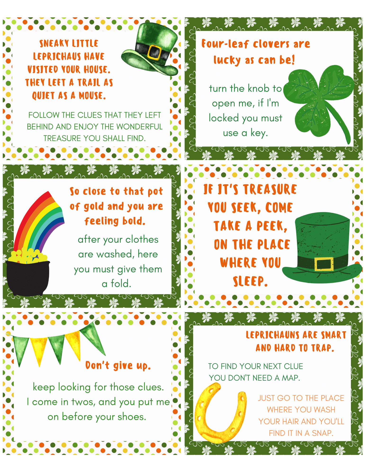 1. Sneaky little leprechauns have visited your house. They left a trail as quiet as a mouse. Follow the clues they left behind and enjoy the wonderful treasure you shall find. Place this clue at the beginning of your treasure hunt to get the kids started. It can be left in a central location, like the kitchen or family room.