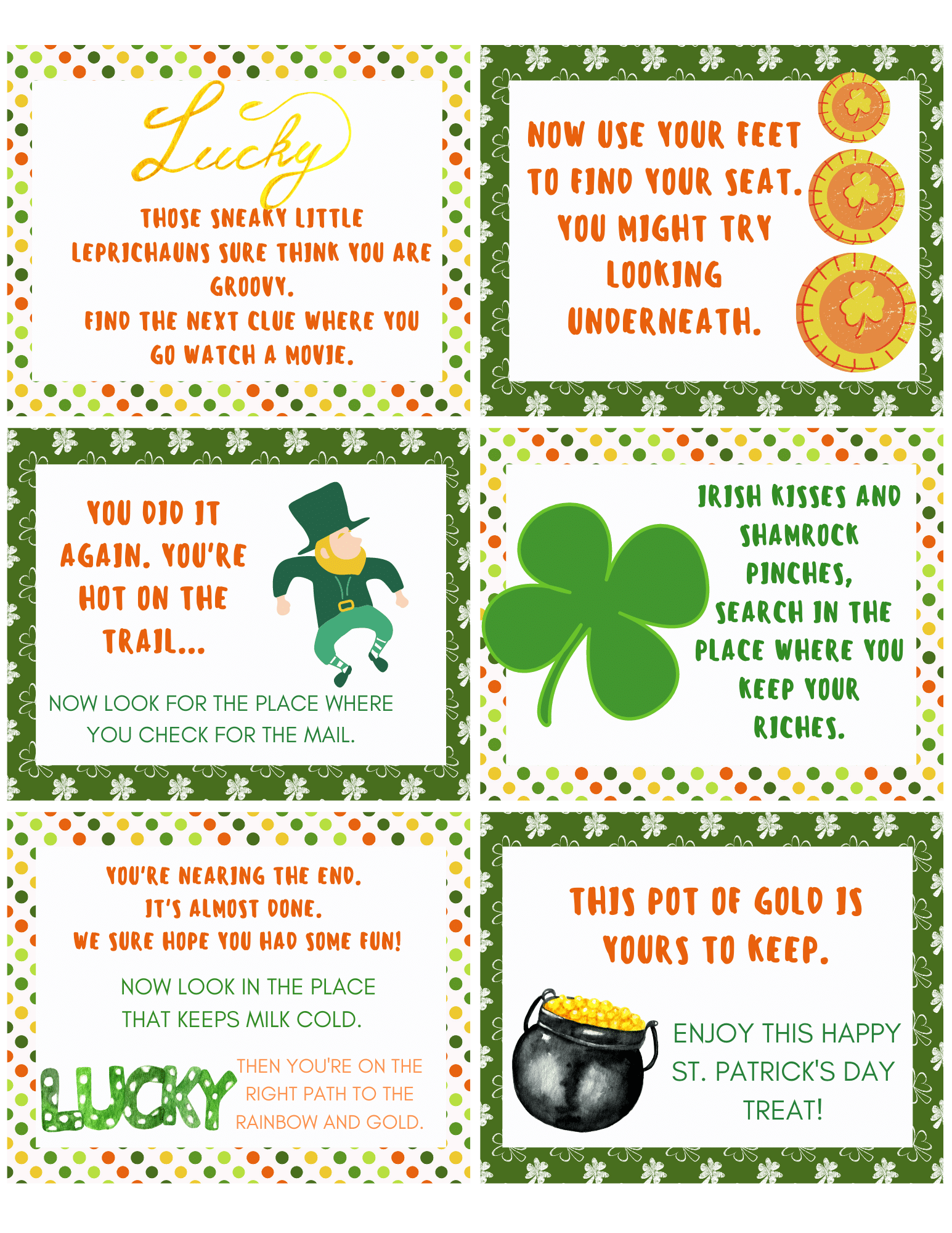 12. This pot of gold is yours to keep. Enjoy this Happy St. Patrick’s Day treat. Finish the St. Patrick’s treasure hunt by placing this final clue in or near the refrigerator, along with a small gift for your kids to enjoy.