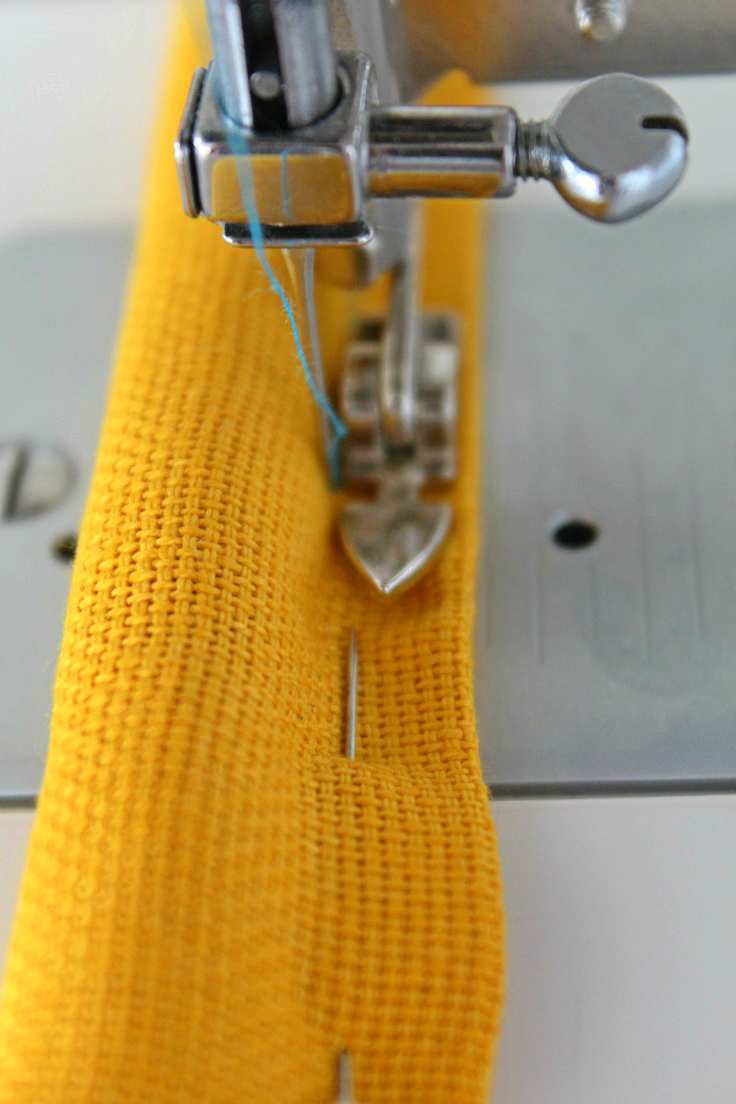 - Next, with the fabric still folded under, sew close to the edge of the fabric. You can use a basting stitch, just to keep the hem in place while going through the next step.