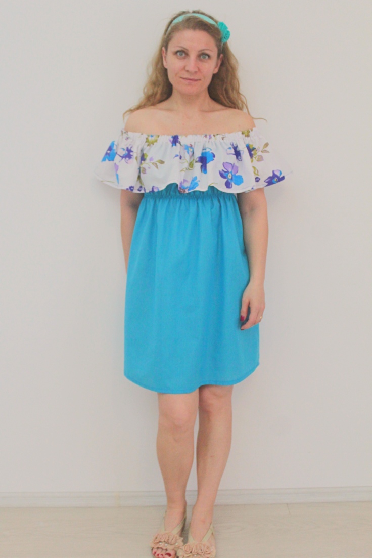 - Take the front and the back pieces of the dress and join at the shoulders, pin and sew down. Finish with a serger or a zig zag stitch.