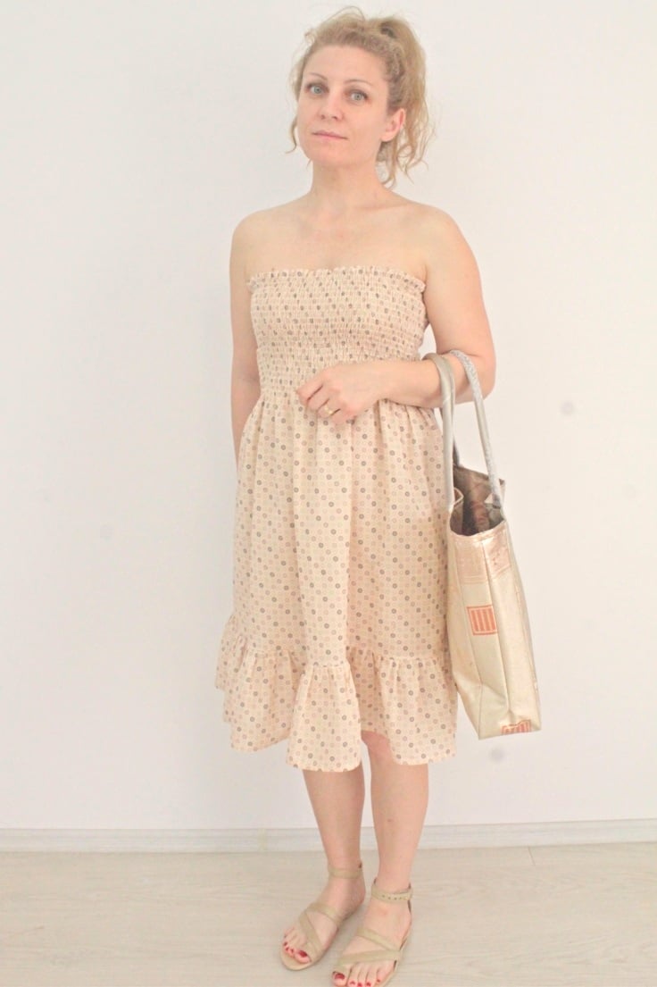 I made a very deep neckline for my v neck dress pattern because I intended to wear it with a bandeau and also wanted to make this dress a good option for nursing mamas. When I was breastfeeding Ellie I used to have a similar neckline blouse and it was a wonderful help!